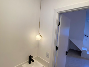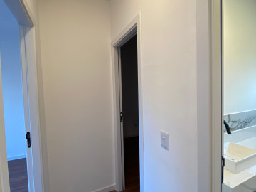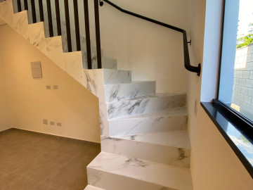 Escada com acabamento em porcelanato, guarda corpo ripado, ALEXA echo pop, Interruptores touch com acionamento por comando de voz ou app alexa e iluminação em led.