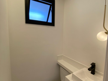 Acabamento do banheiro em porcelanato, banheiro com box, piso laminado.